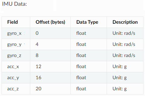IMUデータのフォーマットは、Livox_SDK2のプロトコル仕様に準拠し、下記の表の通り、加速度データ(acc_x,acc_y,acc_z)は単位:“g”で出力されます。