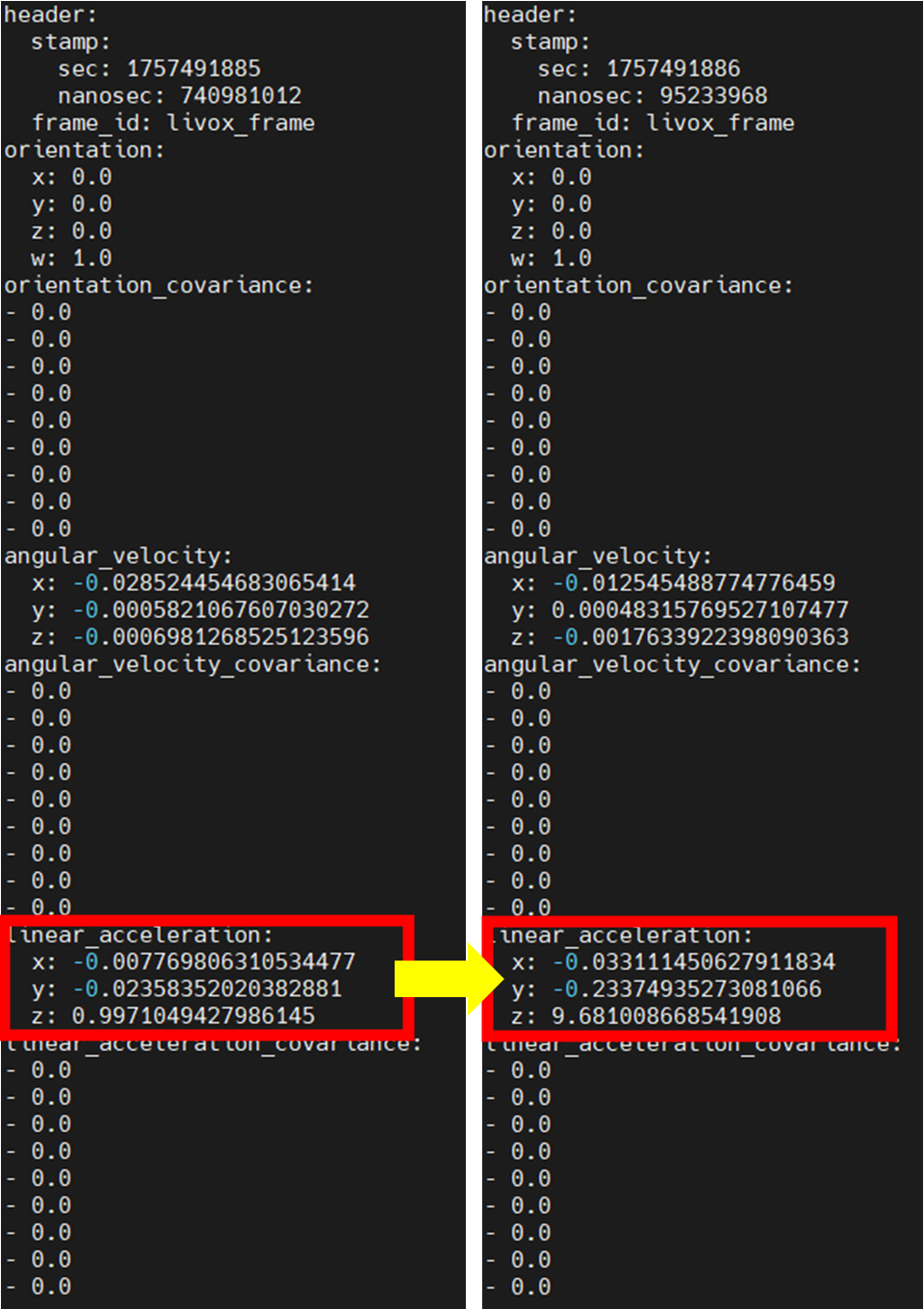 そこで、livox_ros_driver2から出力される加速度データを“m/s²”に変換する専用ノードを作成しました。
