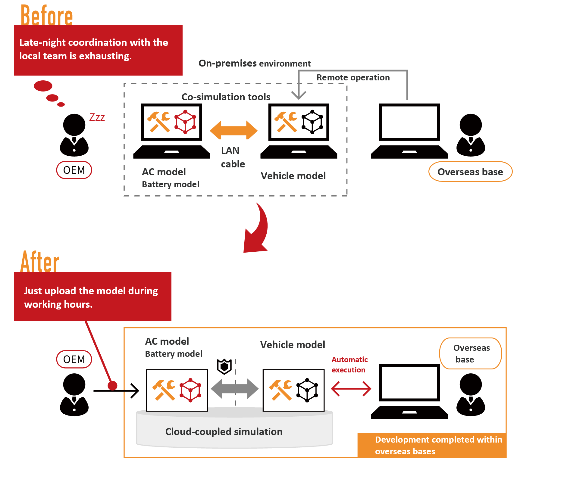 Company A, a Japanese firm developing products for overseas markets, wanted to utilize parts models from Japanese suppliers. However, due to the confidentiality of the parts models, providing them overseas was difficult. This led to an inefficient development system where local employees had to travel to Japan and conduct simulations under the supervision of Company A’s staff, coordinating schedules.