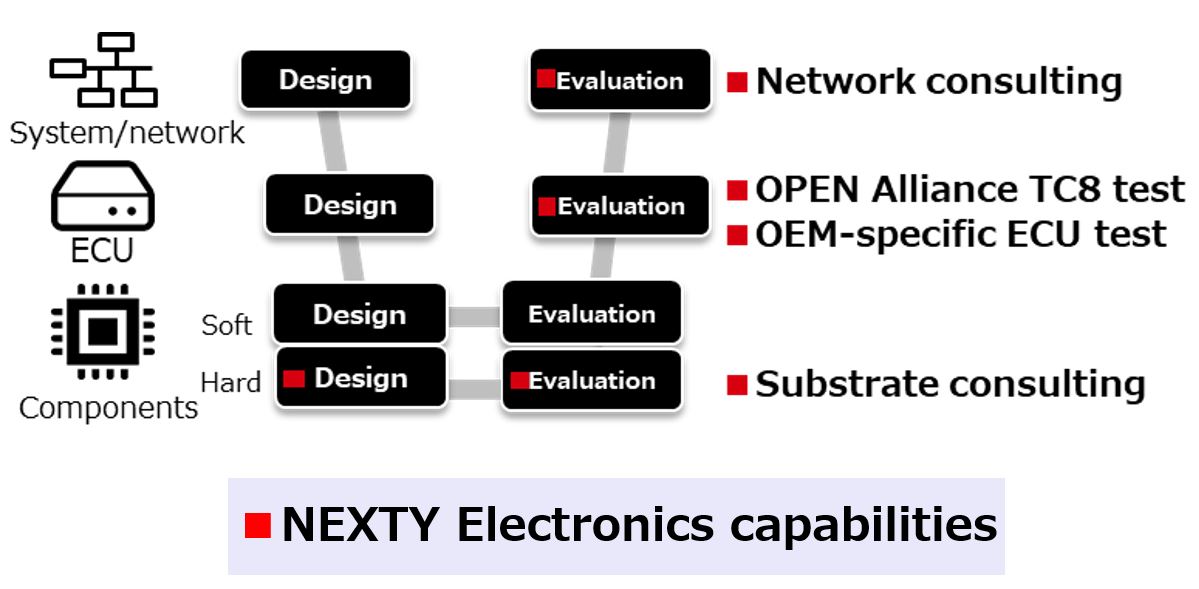 To address these issues, NEXTY Electronics and group company C&S, which possesses an extensive track record and know-how related to in-vehicle communication and conformance testing in Europe, launched test house brand NeefA. Under this brand, the companies have begun offering in-vehicle Ethernet test house services, including a wide range of tests and consulting on everything from components to the system as a whole. In addition to standardized tests for Tier 1 manufacturers in Japan, the companies plan to provide testing services that support the specific evaluation specifications of car companies. Support is available for ECUs equipped with in-vehicle Ethernet ICs from any manufacturer.