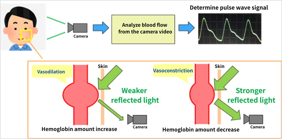 This system is able to measure people's pulse rate by analyzing blood flow based on facial images captured by a camera. By applying NEXTY System Design's proprietary algorithm to analyze detected pulse waves, the system can also estimate stress levels and emotional states.