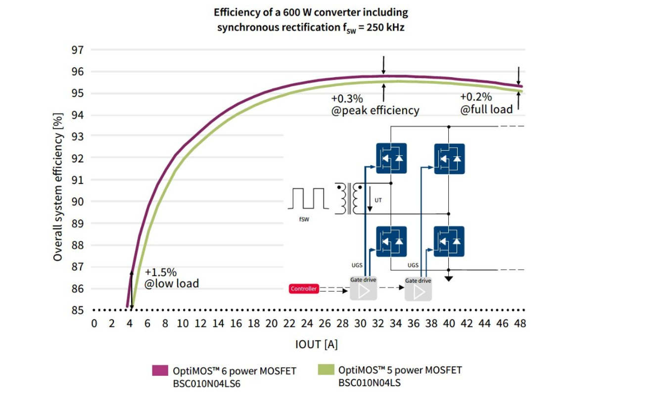 The new OptiMOS6 outperforms SFET5 at lower loads due to lower Qg. At higher loads, Ron is crucial. (In this case, the same Ron can be improved.) Some applications, such as servers, operate with low load. Application benefits can combine the advantages of both cooling and power costs. (Optimization of low load and high load) (more info)