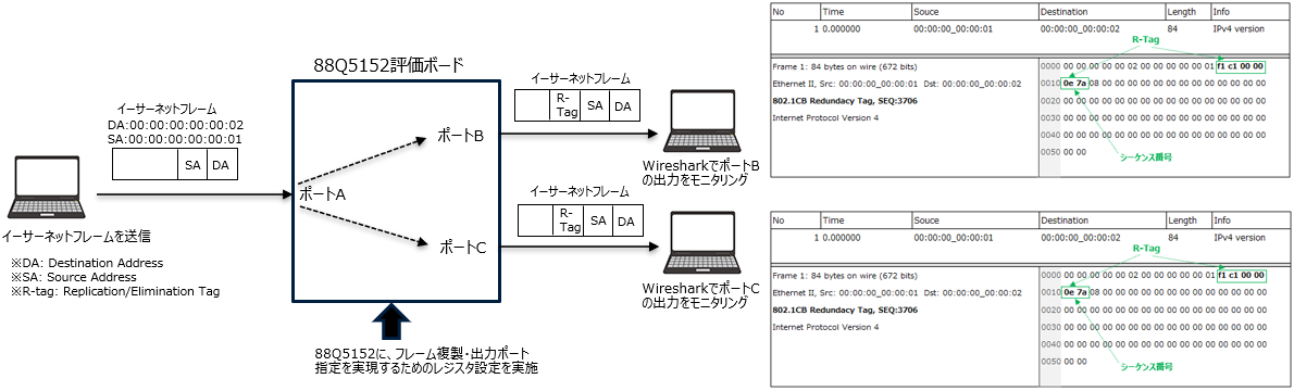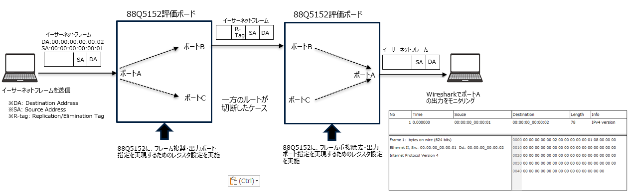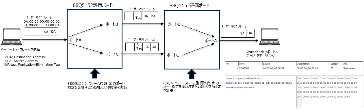 We configured 88Q5152 for FRAMES duplication and output port specification, and confirmed that identical FRAMES with R-Tag were output from two ports (observation point: sending output port).