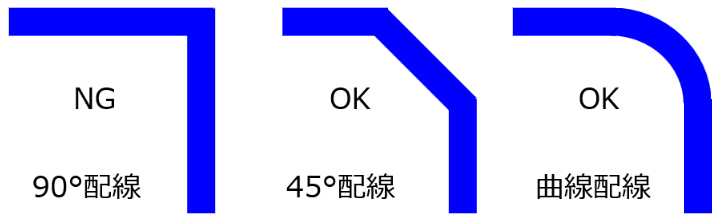 Furthermore, right-angle wiring should be avoided as it can unintentionally cause variations in wiring width. Instead, aim for smoother routing using 45-degree or curved wiring.