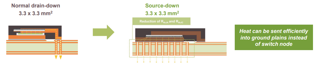 ソースダウンは、他のソリューションに比べ、低いRDS(on)や高い放熱性などの利点があります。