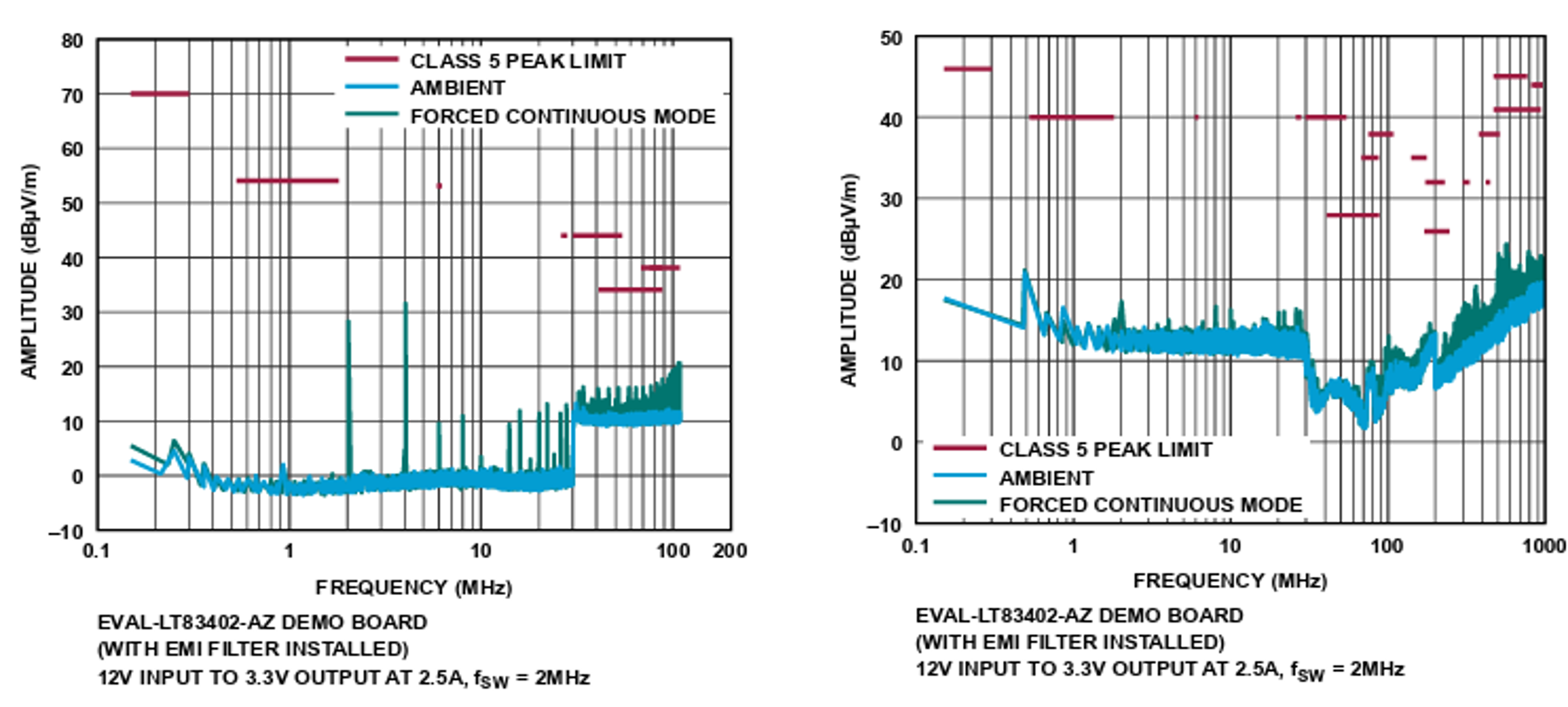 Silent Switcherアーキテクチャは、高スイッチング周波数で高い効率を実現しながら、電磁場干渉(EMI)放射を最小限に抑えます。
