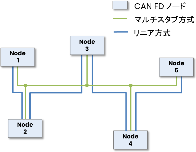 スタブ(枝分かれ)があるようなCANバス上において、高速通信を行うにはリニアトポロジー(ディジーチェーン)での接続を行う方法がありますがハーネスの増加によるコストや重量の増加が懸念されます。