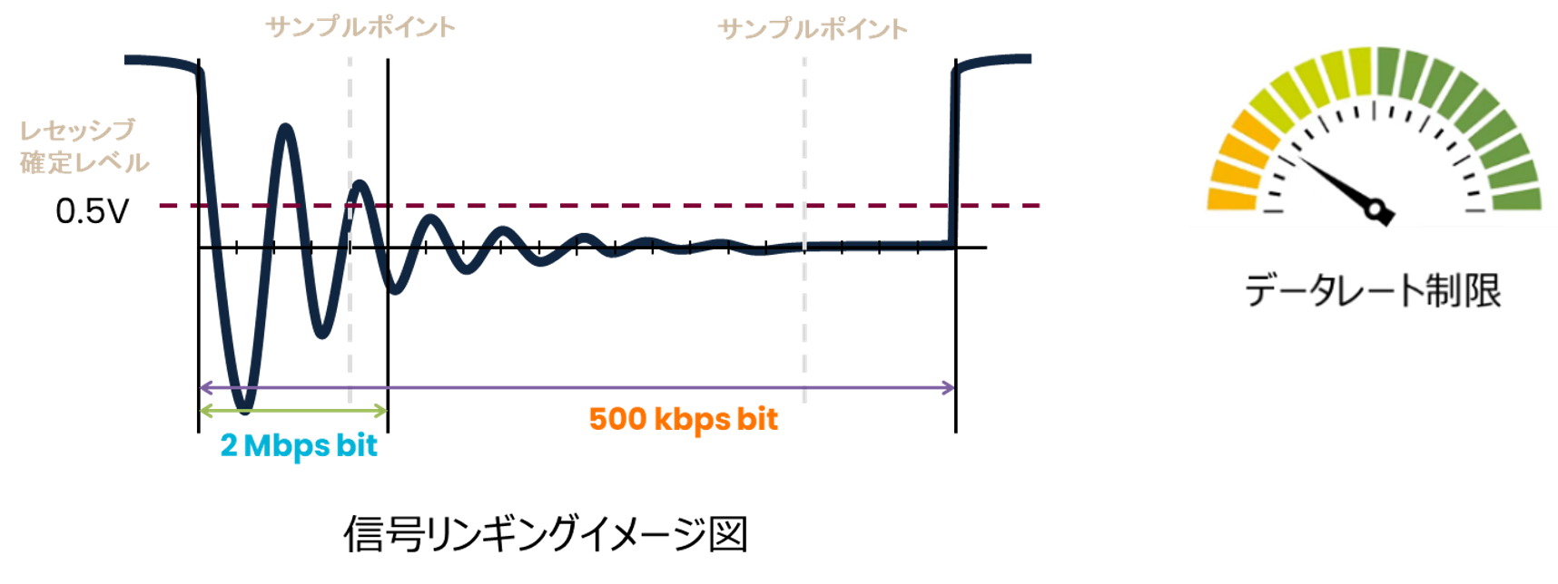 FDでは1bit長が短いのでサンプルポイントまでの時間が減る事を意味しており、従来のCAN通信であれば問題にならなかったリンギング収束時間が問題になります。