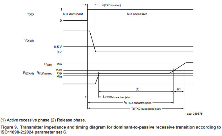 SICではドミナント-リセッシブエッジ後のインピーダンスをLowからHighへ一気に切り替えず中間インピーダンス領域(75-125Ω)を持たせています。また、TXDリセッシブから測定して最大530nSecとなります。
