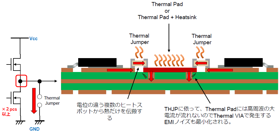 熱源から放熱先までの距離を短くし、放熱先の銅面積を確保することが重要です。必要に応じて複数個を並列配置し、熱伝導率をさらに上げます。銅箔やサーマルビアを追加せずに改善できるため、既存基板の改修にも有効です。