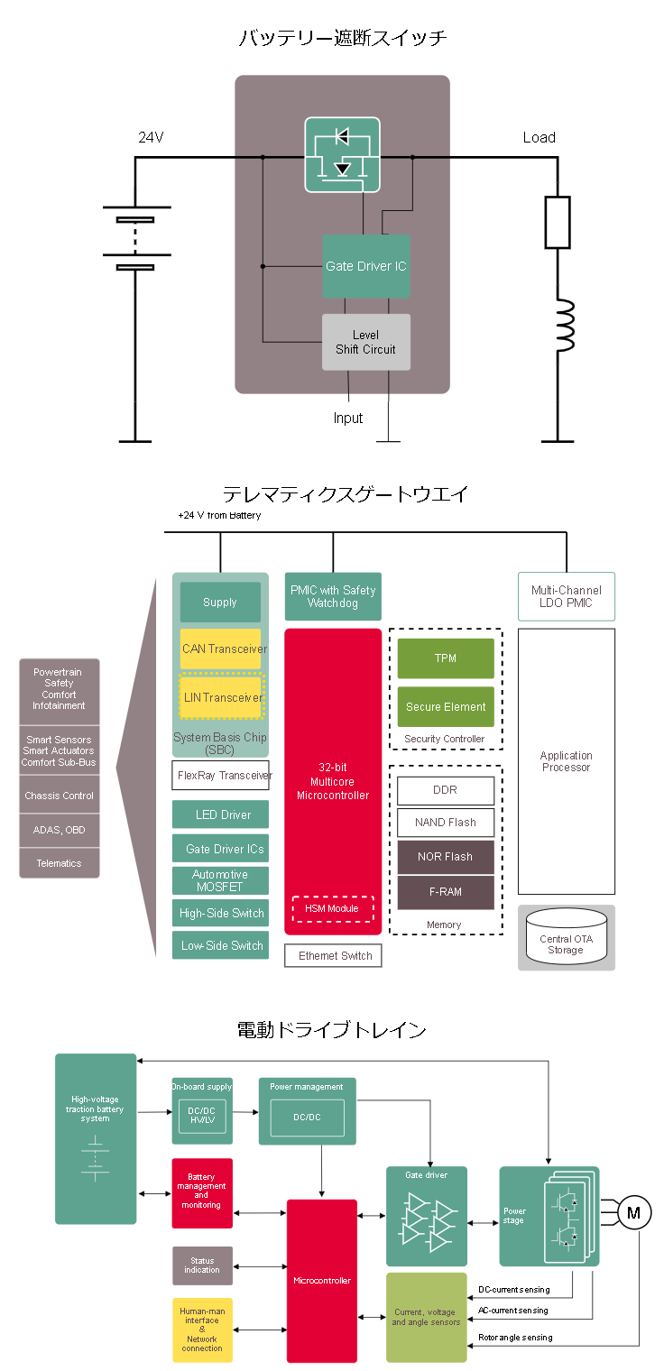 CANやLIN、電源システムを高度に統合したSBC(System Basis Chips)や、機能安全に対応したPMIC(Power Management ICs)がテレマティクスゲートウエイアプリケーションの小型化や信頼性向上に貢献します。