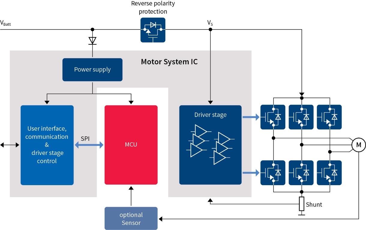 インフィニオンのモーター システム IC は、統合されたブリッジ ドライバー、電源、CAN FD / LIN 通信インターフェースを備えた統合ソリューションであり、必要な基板スペースと部品数を大幅に削減します。