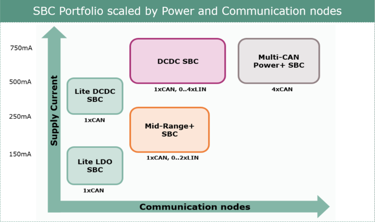 ・SBC(システムベーシスチップ) - システム電源(LDO、DCDC)、通信インターフェイス、診断、スイッチング機能、故障出力を1つの製品に集約し、高機能且つ省スペース化を実現いたします。
