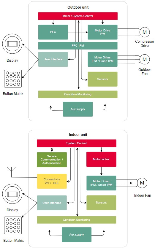 ルームエアコン システム向けのインフィニオン製品は、統合が容易で、より小さく薄いフォーム ファクター、より小型のパッケージ、高い電力密度を備えており、競合他社より競争力の高い製品開発を実現する信頼性とエネルギー効率を提供します。