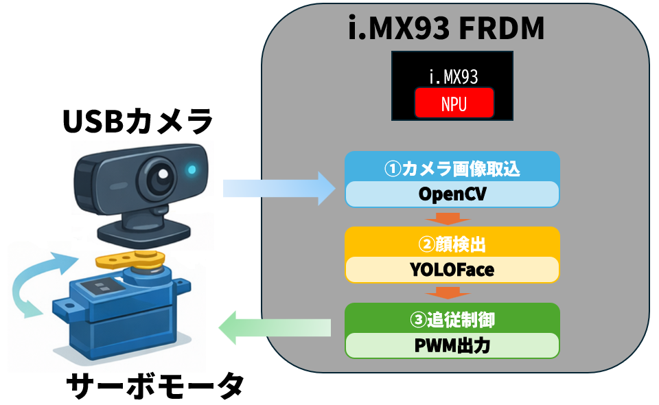 以下ではFRDM i.MX 93開発ボードを利用して顔検出モデルの実行からサーボモータ制御、そして人物追従カメラの構築までをステップごとに解説します。