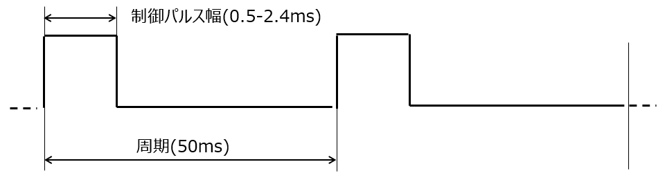 3-1の図に示したように制御するサーボモータは周期が50ms、制御パルス幅は0.5-2.4msです。