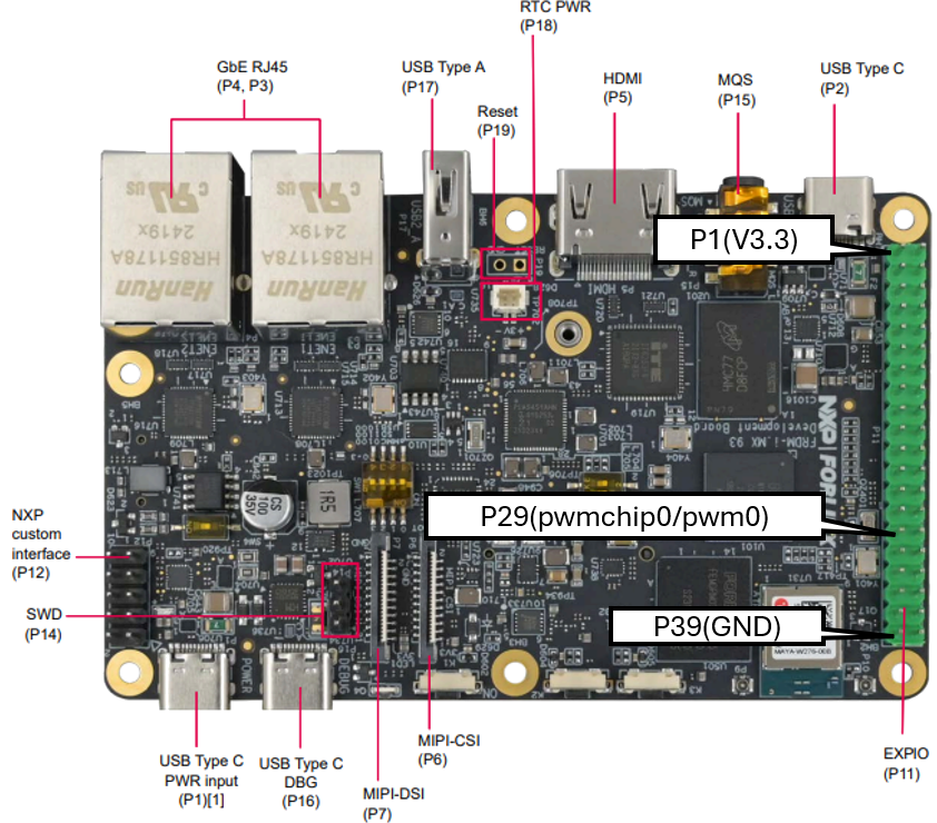 ビルドしたBSPを書き込むとFRDM i.MX 93開発ボードのPWM信号の出力は基板上のRGB-LEDに接続された状態になります。そのためサーボモータを制御するためにはこの出力をヘッダーピンへ変更する必要があります。