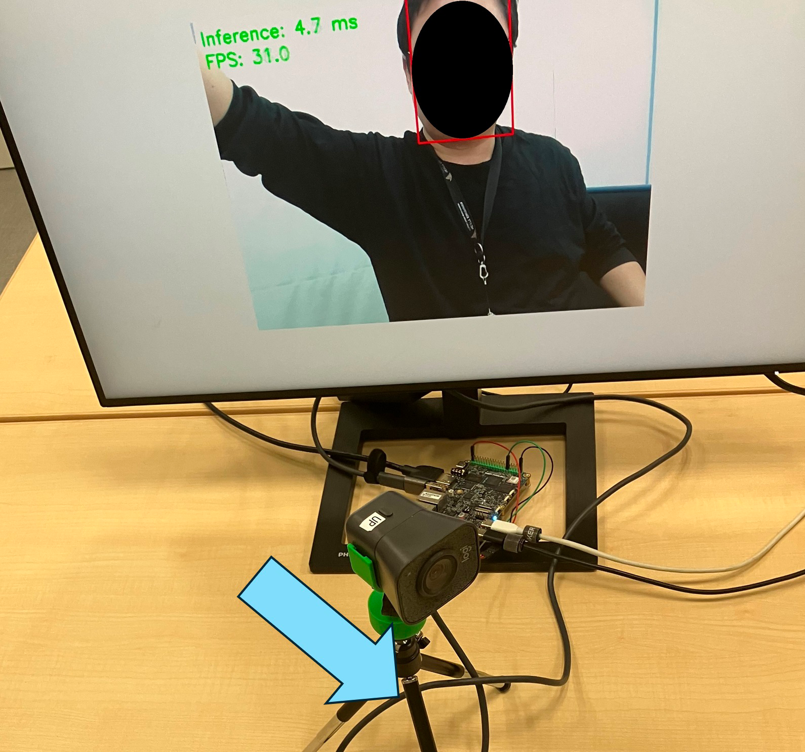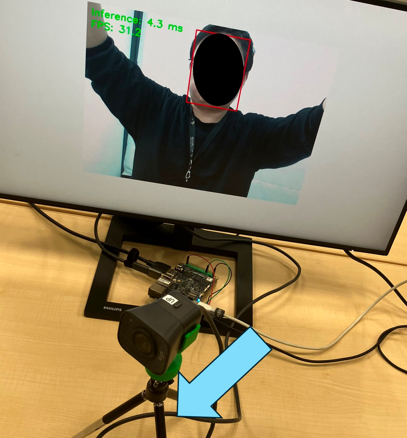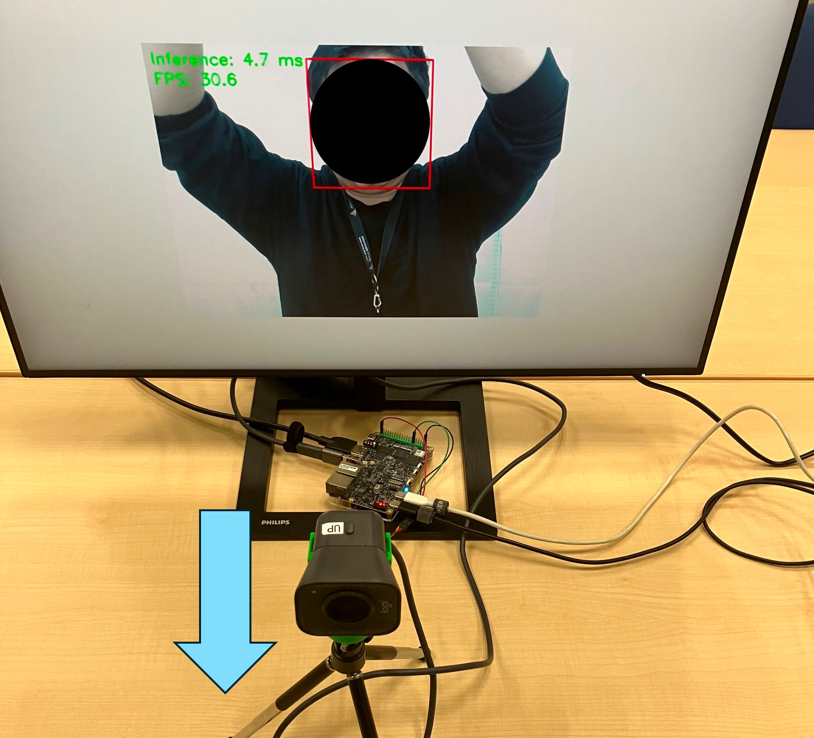 USBカメラから入力された映像をOpenCVで取り込み、NPU上でリアルタイムに顔検出を行います。