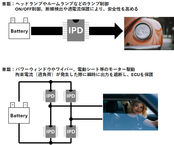 IPDは車載システムから産業機器、さらにはIoTデバイスまで、さまざまな用途で安全性・快適性・省電力化を実現します。以下に、主な応用分野をご紹介します。