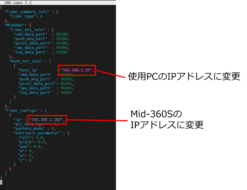 Livox ROS Driver 2 では、設定ファイル(livox ros driver2/config/MID360s_config.json)で接続する LiDAR を指定します。