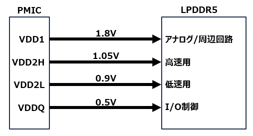 さらに LPDDR5 では電源構造も整理され、VDD1/VDD2H/VDD2L/VDDQ といった電源が用途別に分割されました。