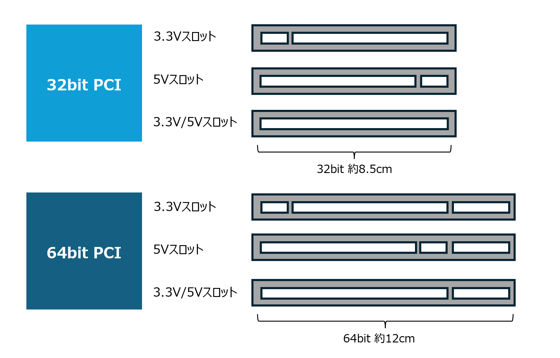 電圧仕様:3.3Vまたは5V対応。キー(PCIスロットの切り欠き)位置で互換性を判別。