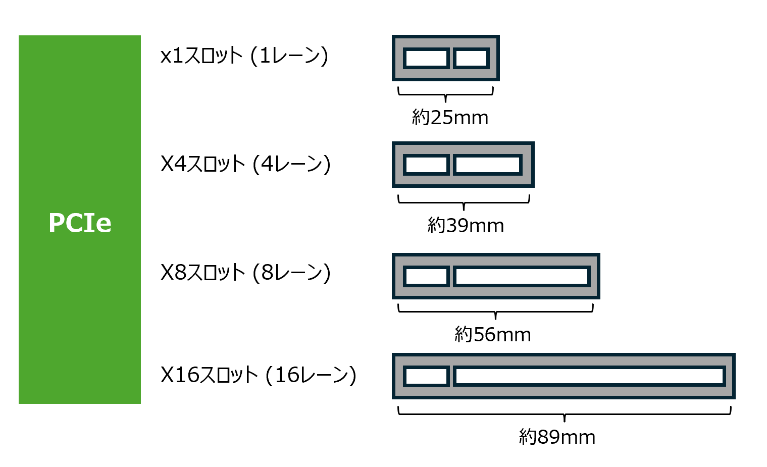 - 形状:レーン数に応じて長さが異なる。x1(約25mm)、x4(約39mm)、x8(約56mm)、x16(約89mm)。