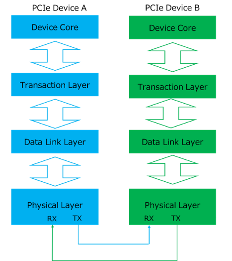 PCIeバスはシリアル接続方式を採用し、データはパケット(Packet)形式で転送されます。パケットは、トランザクション層(Transaction Layer)、データリンク層(Data Link Layer)、物理層(Physical Layer)の3つの階層を順に通過します。PCIeバスの階層構造を以下の図に示します。