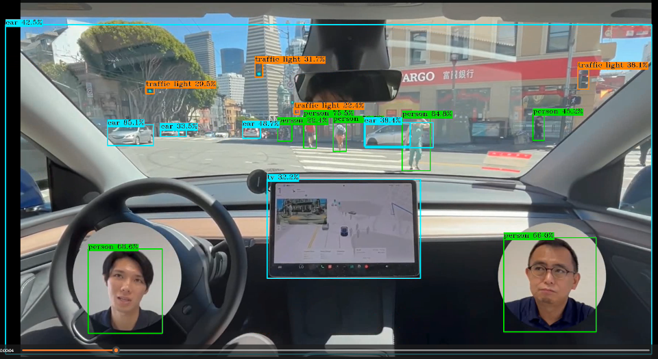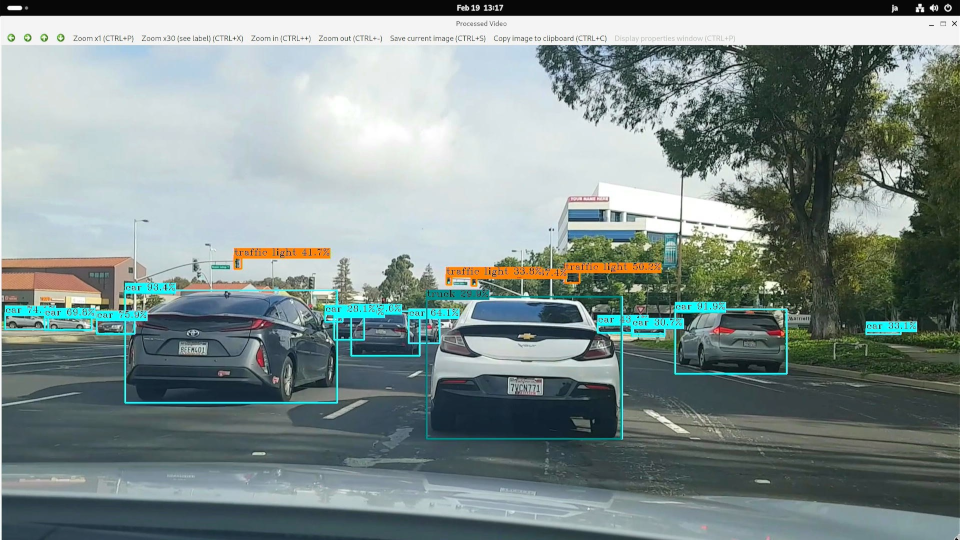 画像のようにYOLOv8mで物体検出した結果が動画で表示されます。遠くの信号や車もリアルタイムに検出できており、Hailo-8の処理性能がおわかりいただけると思います。