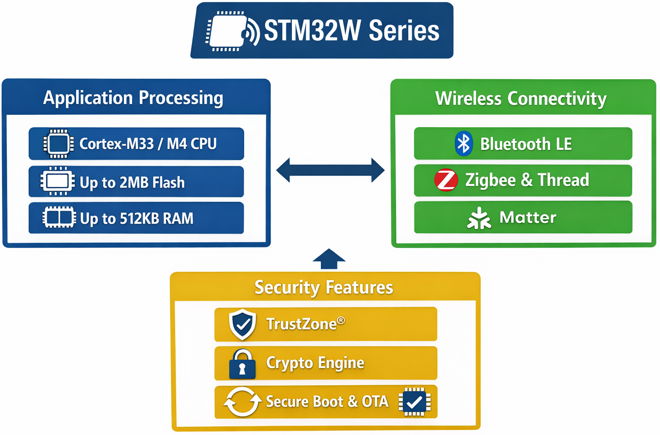 STM32Wシリーズは、STMicroelectronicsの32bitマイコン「STM32」ファミリーに属する無線通信機能を内蔵したSoCです。IoT機器やスマートホーム、産業用ワイヤレス機器では、無線接続を前提にしたシステム設計が当たり前になりつつあります。その中でSTM32Wシリーズは、拡張性・セキュリティ・低消費電力という相反しがちな要件を、1つのデバイスでバランス良く成立させることを目的に設計されています。