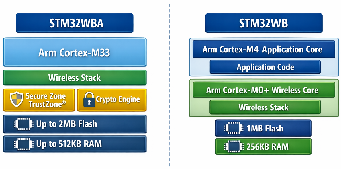 STM32WBは「無線処理を専用コアに分離して安定運用・既存資産を活かす」方向、STM32WBAは「最新世代のシングルコア+TrustZoneでマルチプロトコルとセキュリティを統合的に伸ばす」方向、として選択可能です。