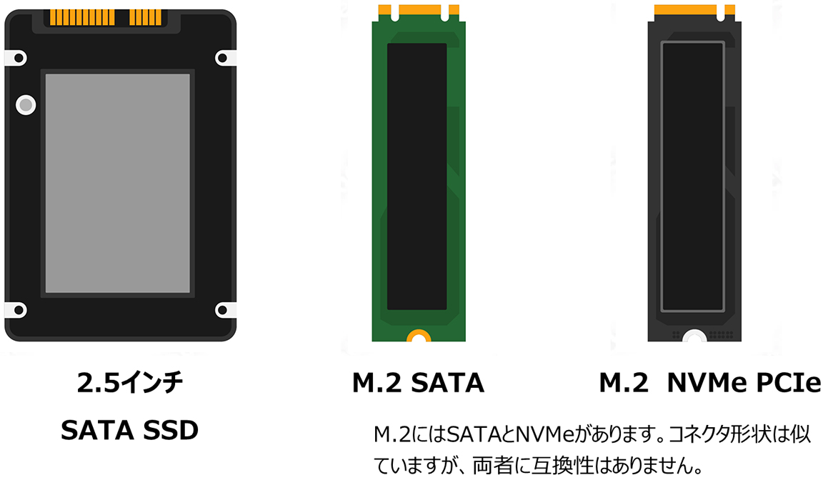- 2.5インチ SATA:SATA接続に対応し、HDDの代替として広く使われています。